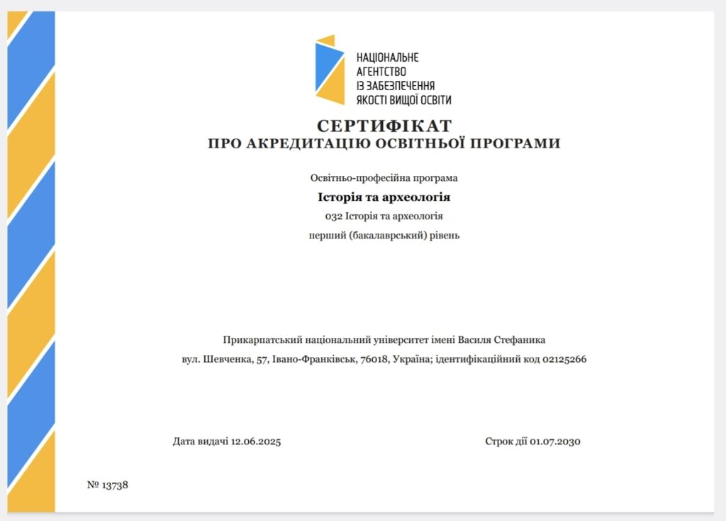 Отримано сертифікат НАЗЯВО про акредитацію освітньої програми “Історія та археологія”